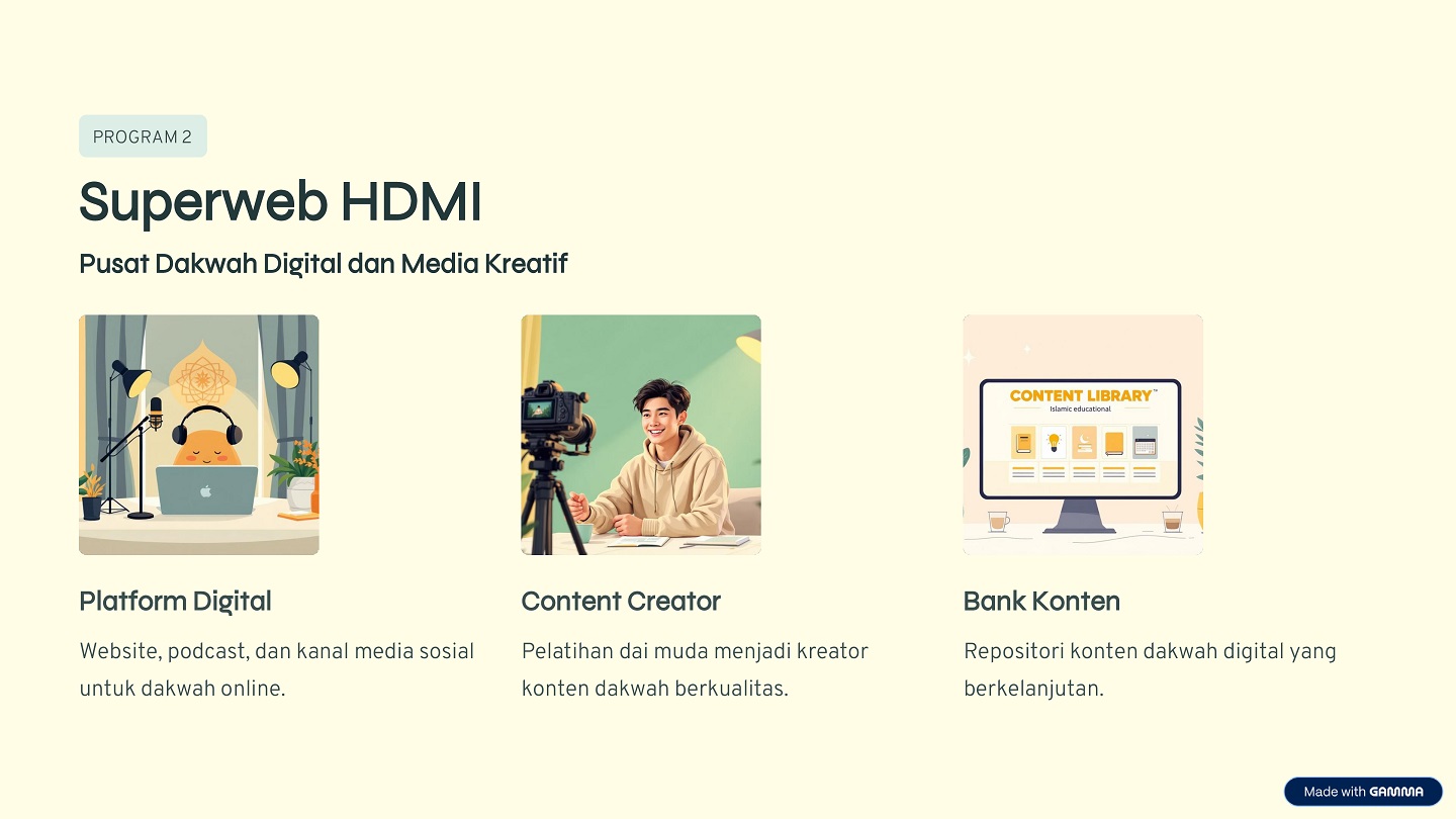 Superweb HDMI merupakan ekosistem dakwah digital yang memfasilitasi dai muda untuk berdakwah melalui media online secara efektif dan terukur.